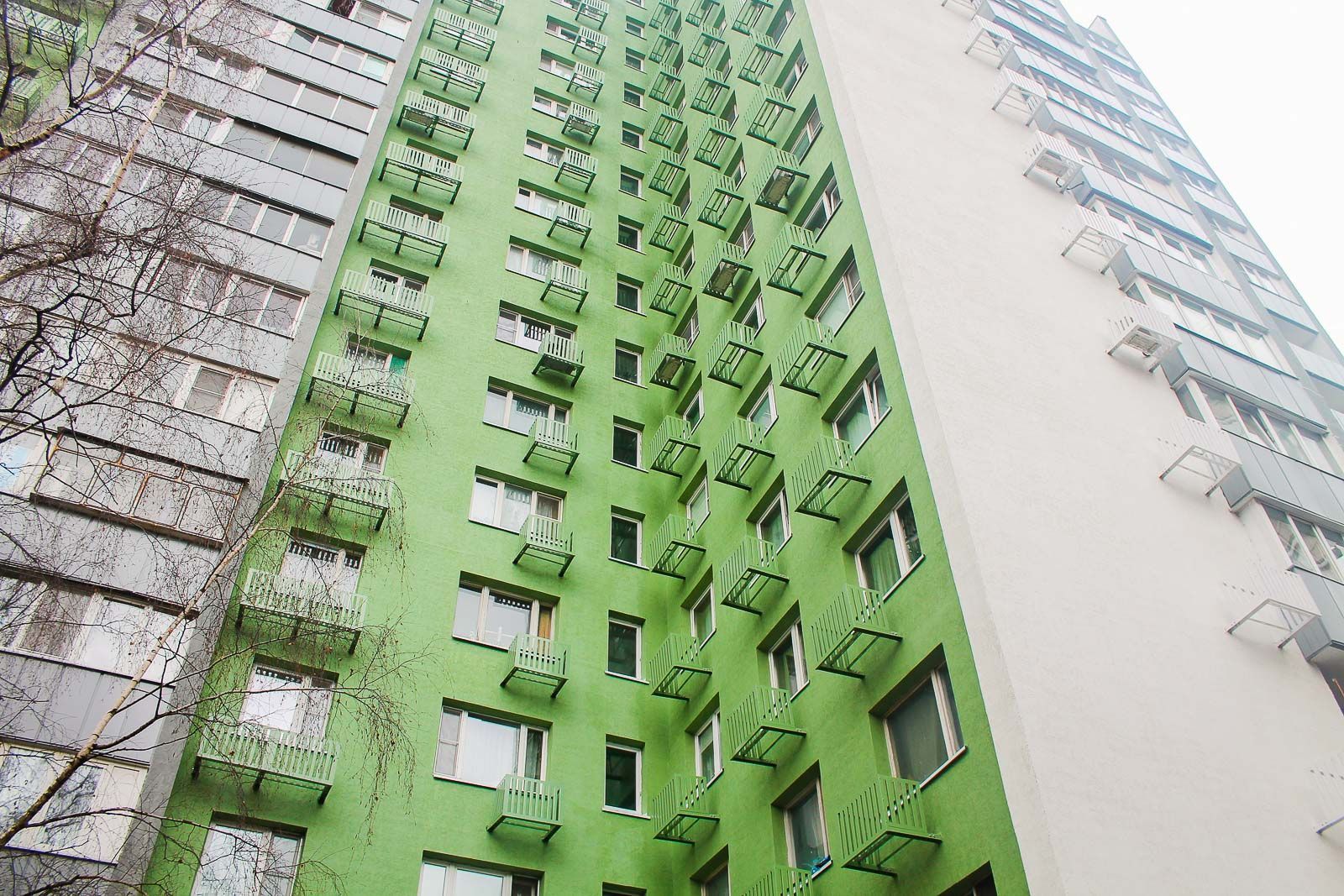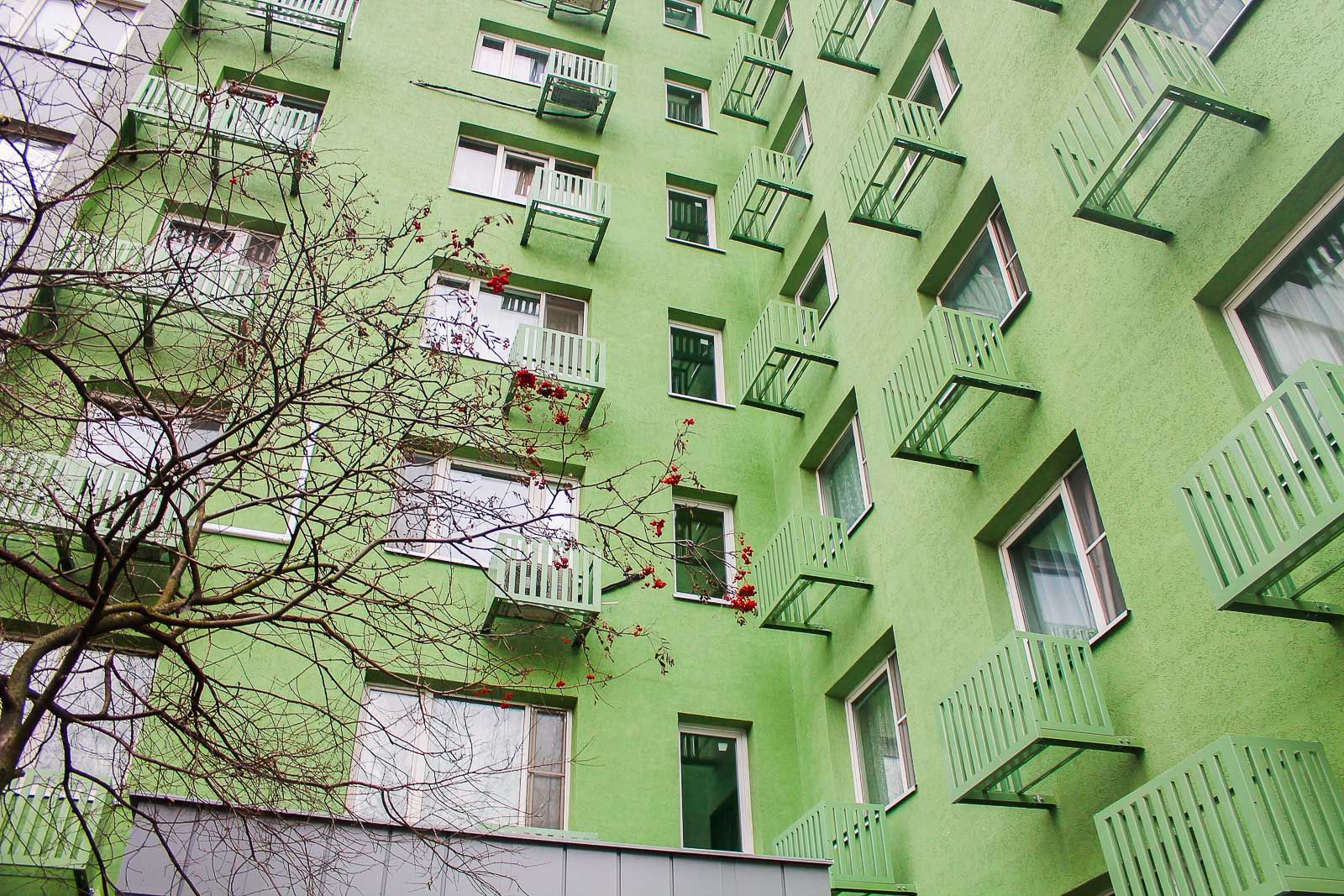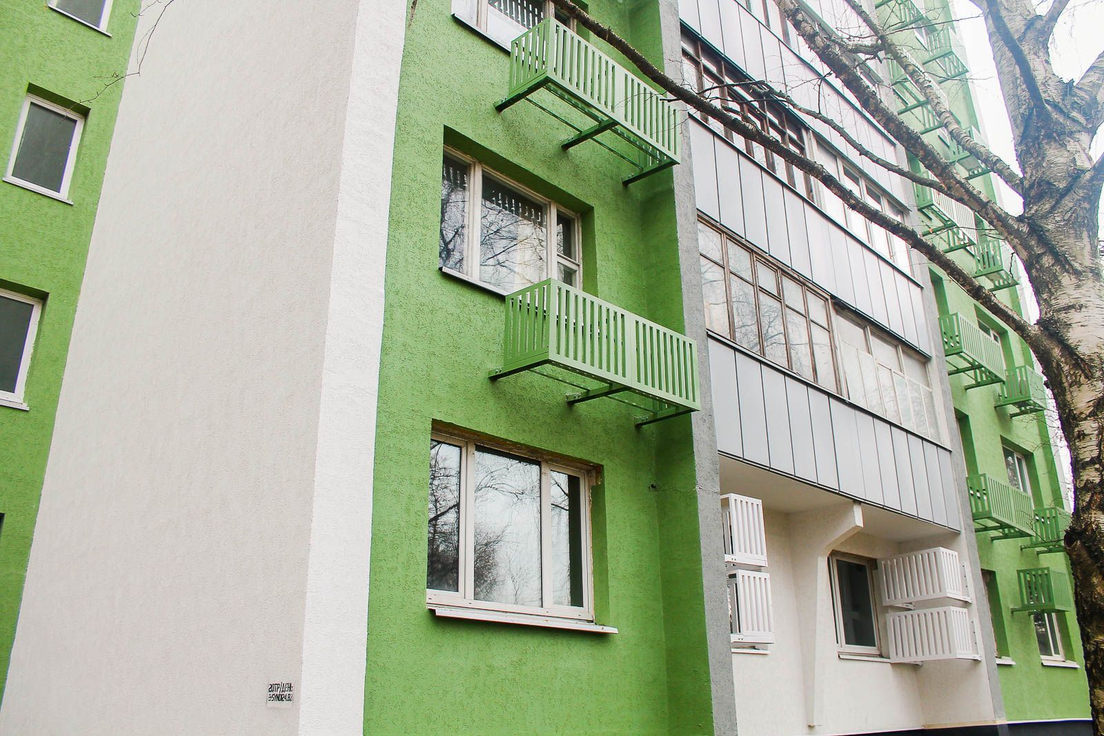 Далее провели монтаж утеплителя из минеральной ваты, который оштукатурили базовым слоем, а затем закрепили сетку из стекловолокна. Конструкцию покрыли декоративной штукатуркой, после чего мастера окрасили поверхности в тона "сигнальный белый", "бледно-зеленый" и "транспортный серый". Вместе с процессом окрашивания установили корзины для кондиционеров.