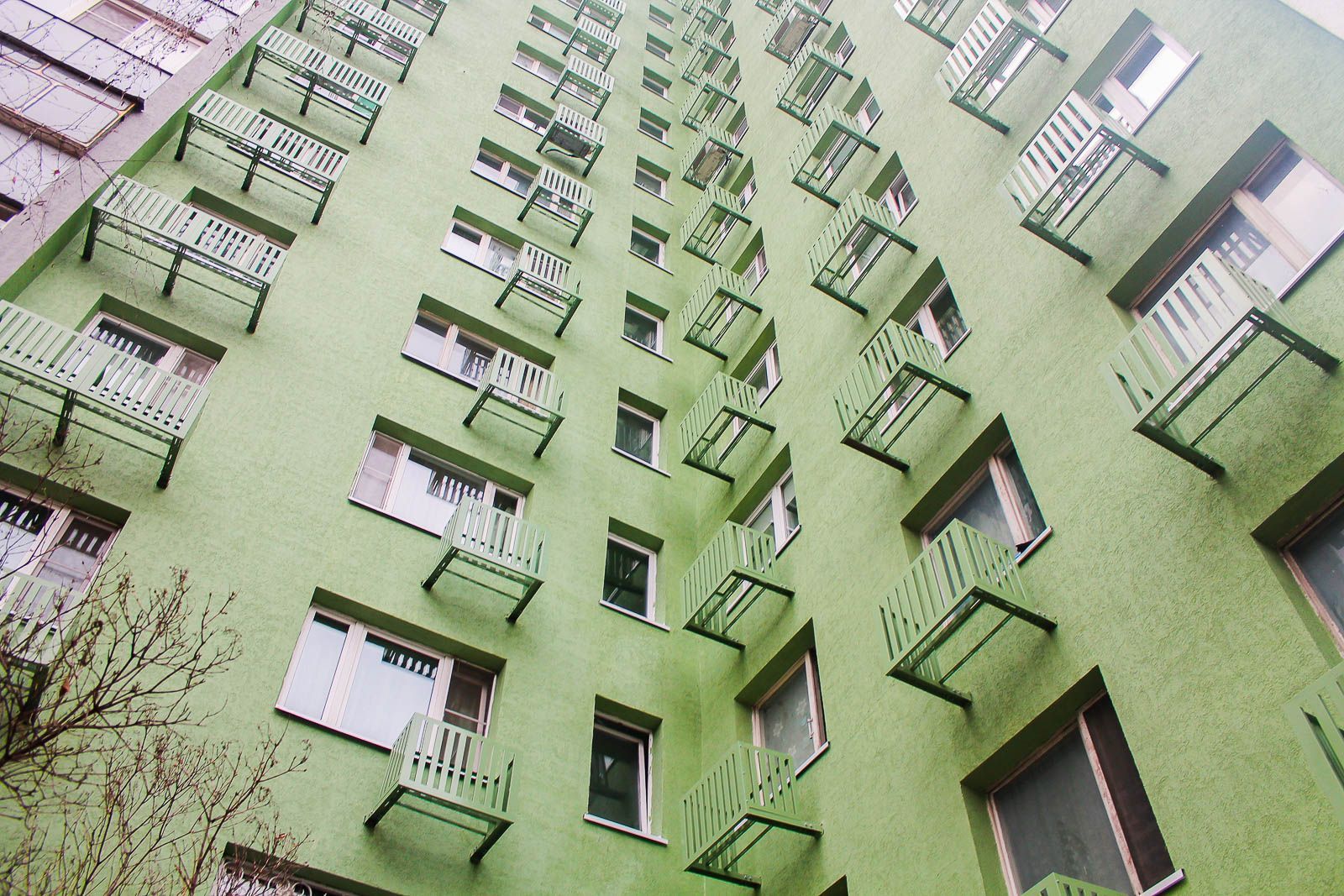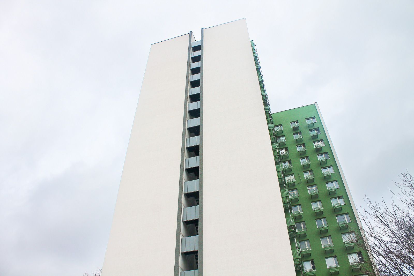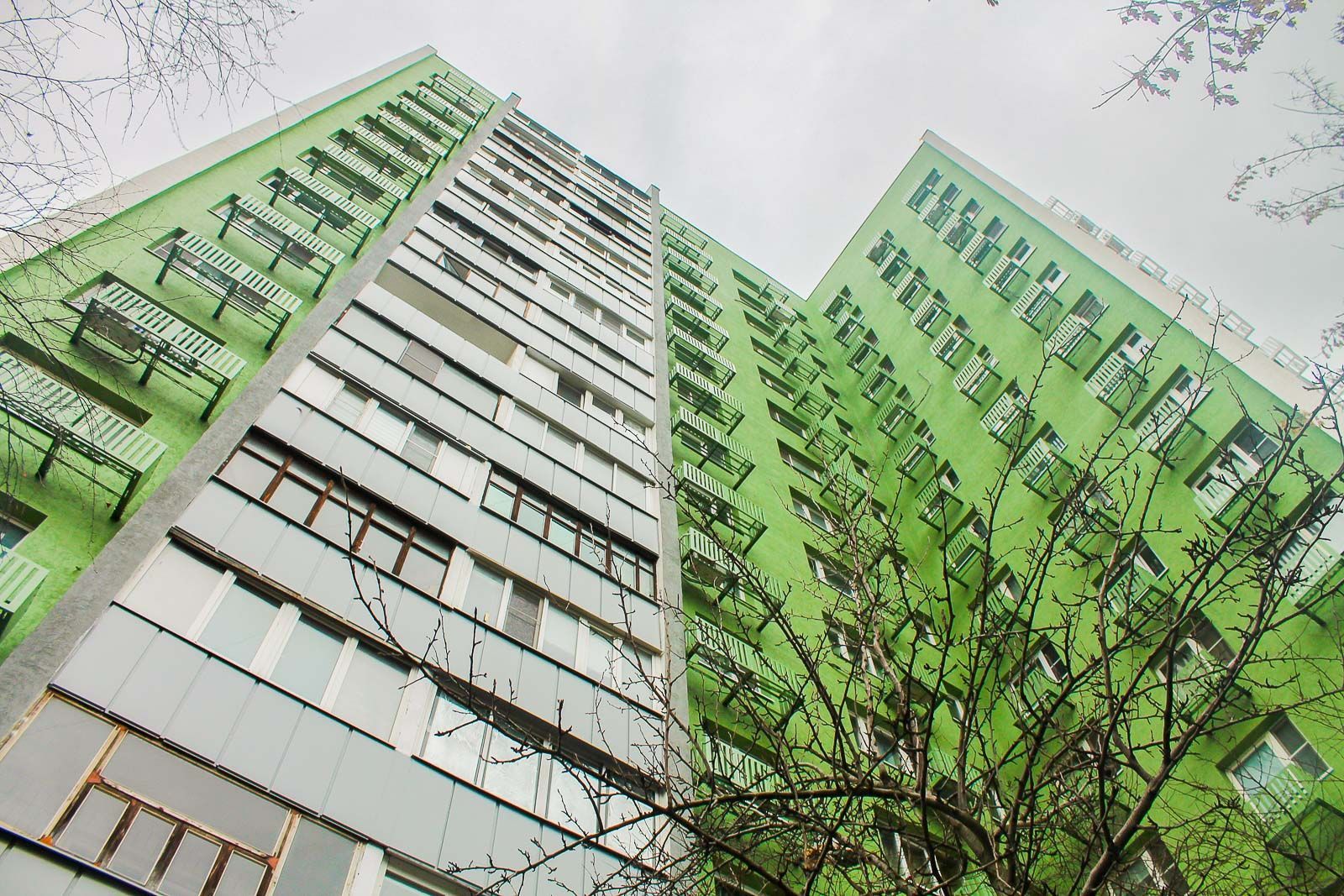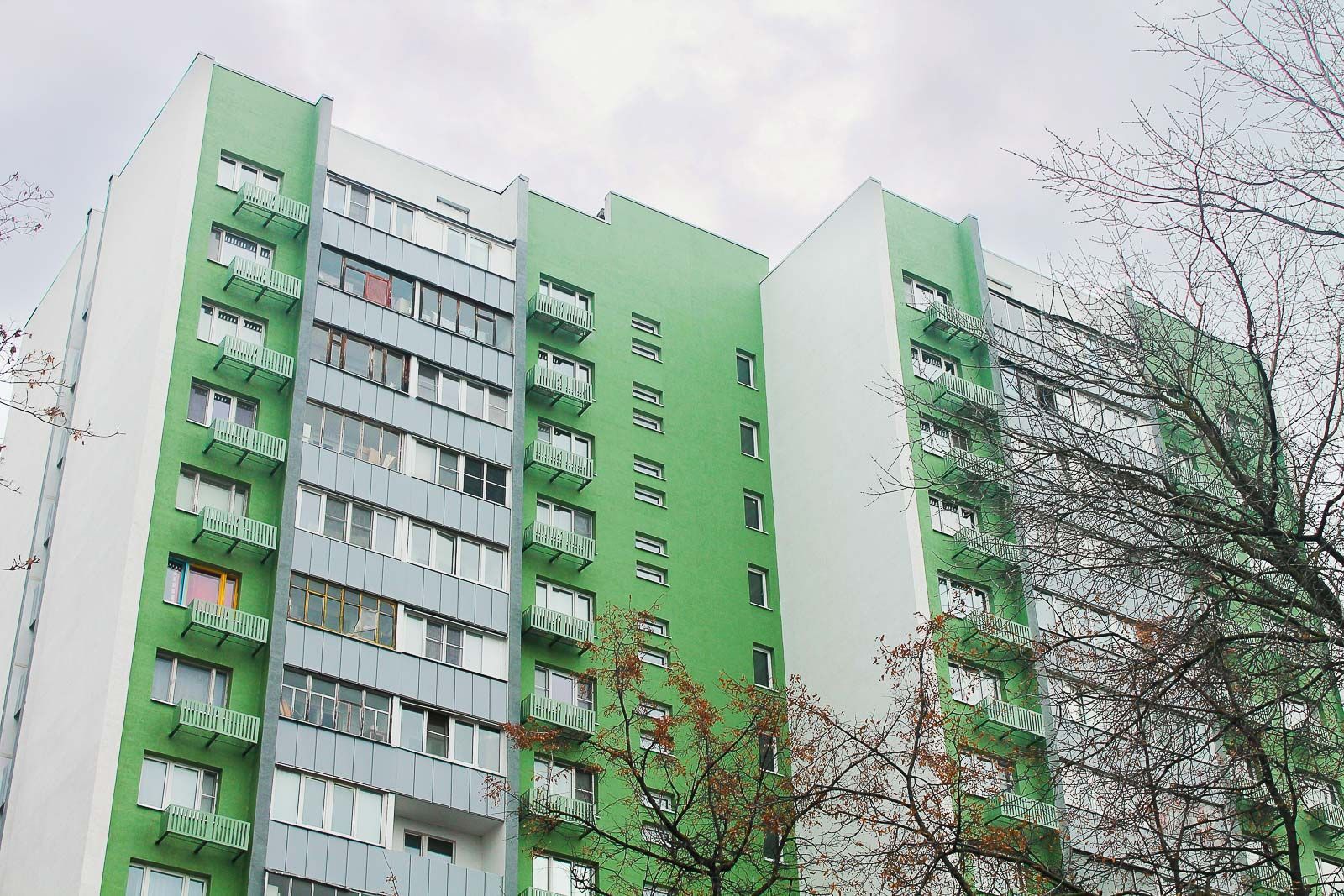 Далее провели монтаж утеплителя из минеральной ваты, который оштукатурили базовым слоем, а затем закрепили сетку из стекловолокна. Конструкцию покрыли декоративной штукатуркой, после чего мастера окрасили поверхности в тона "сигнальный белый", "бледно-зеленый" и "транспортный серый". Вместе с процессом окрашивания установили корзины для кондиционеров.