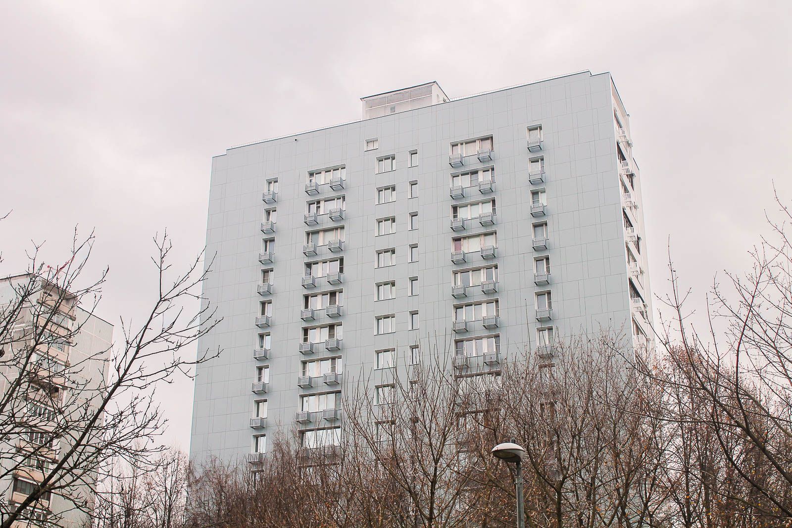 Фасад 16-этажного многоквартирного дома по адресу: Волгоградский проспект, дом 195, корпус 1, получил новое обличие благодаря использованию фиброцементных панелей. Дом, построенный в 1978 году по модифицированной проектной серии, отличается простым планом и классической пластикой фасадов.